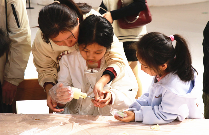 在科普志愿者的指导下,孩子们兴致勃勃地学习配比糯米粉、粘米粉和澄面,在了解材料特性变化的同时,也直观体会到“精准度量”在食品科学中的重要性。压模成型环节更是欢声不断,各种科技主题的定制模具让传统的月饼焕发出浓浓的科技趣味,成为连接团圆亲情与科学好奇的独特载体。