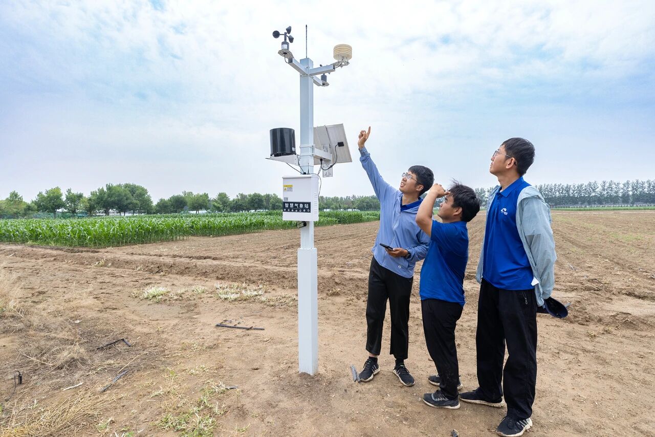 在北京玉米新品种智慧展示园里,夏浩然(左一)正和他的团队查看智慧气象站在田间的运行情况。张寅生 摄