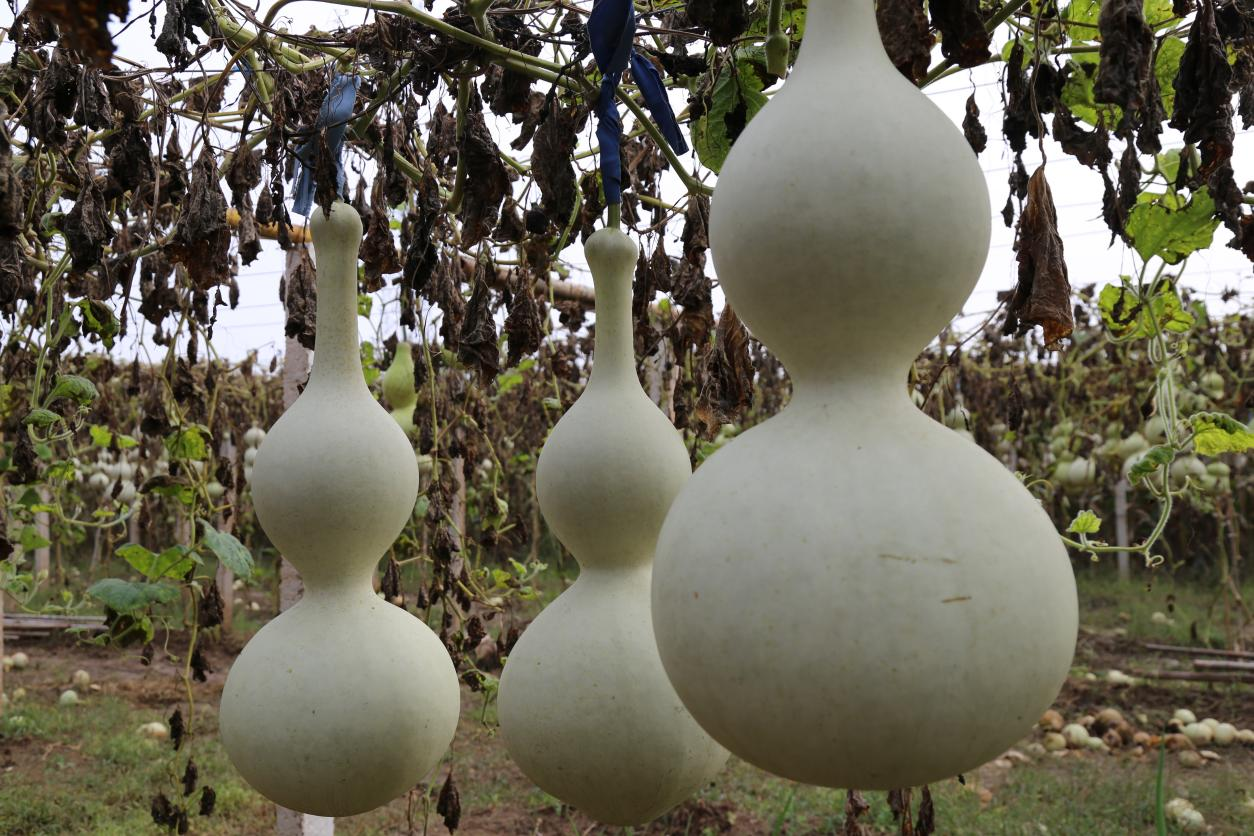 为了方便运输和销售,他还在家中购置了一套加工设备,可以将采摘下来的葫芦进行简易削皮加工。“今年的亩产量大概700个葫芦,品相都很不错。”杨波一边说一边展示着他的葫芦。