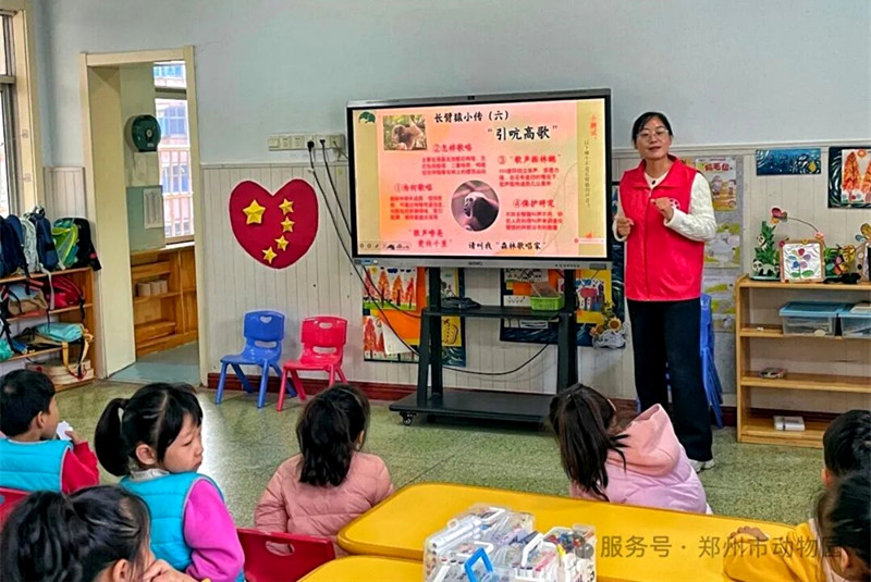 10月24日是国际长臂猿日。为提升广大游客对长臂猿的了解,让更多的公众走近长臂猿、保护长臂猿,10月21日上午,郑州市动物园走进河南省省直机关艺术幼儿园,为大五班的师生们开展了一节以“聆听森林之歌·守护猿声长存”为主题的科普公益课堂。