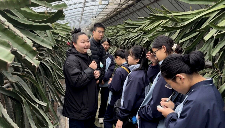 走进“田间课堂”,同学们先后参观了多个特色种植区。在火龙果大棚,同学们认真观察火龙果的花朵和攀援生长的形态,聆听专家讲解其生长条件和培育技术,不仅认识了热带作物的生物特性,也感受到现代农业跨越地域限制的科技力量。