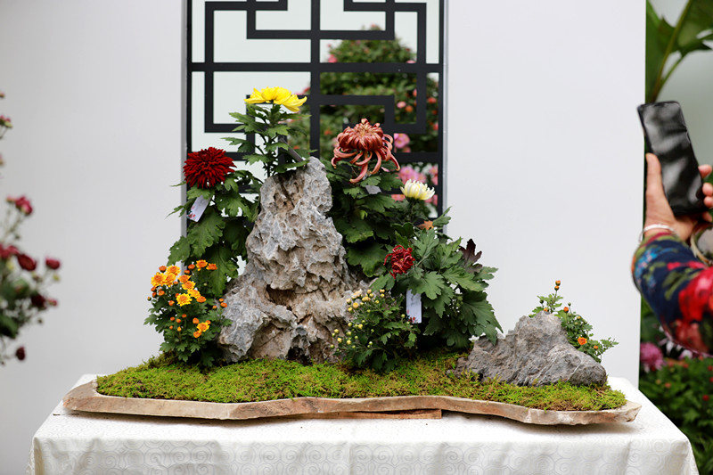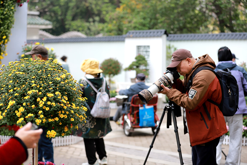 在秋园盆景技艺展出地点,这里有松柏类、杂木类和山石类盆景,以及百余种传统精品菊花品种,颜色丰富多彩,包括红、黄、白、绿和复色,备受众多游客及摄影爱好者的喜爱。