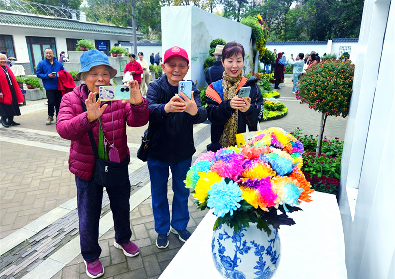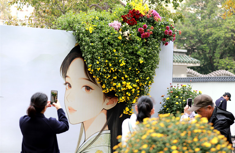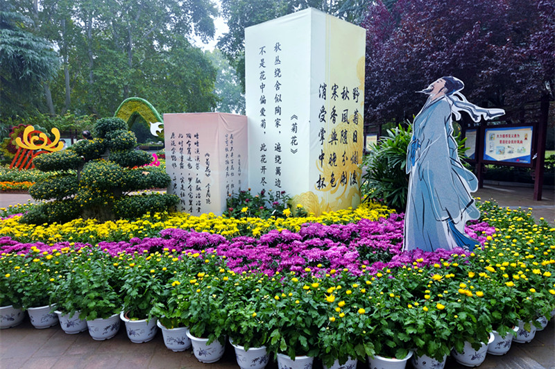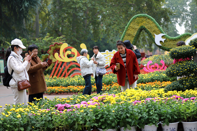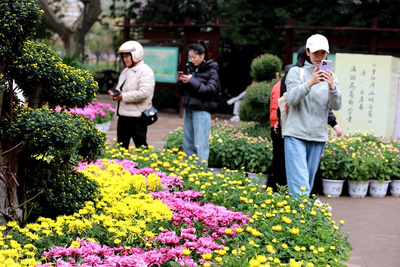 在菊展期间,公园主干道两侧还摆满五彩斑斓的菊花,既有传承已久的经典品种,也有本地新培育的特色菊花。园内摆满的经典与特色菊花形成独特的秋日景象,吸引众多游客前来赏菊。