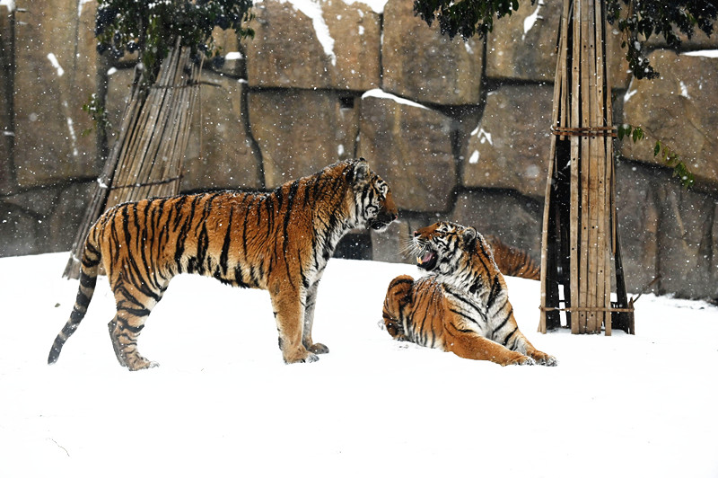 沁阳市和生森林动物乐园,两只东北虎在雪地上嬉戏。