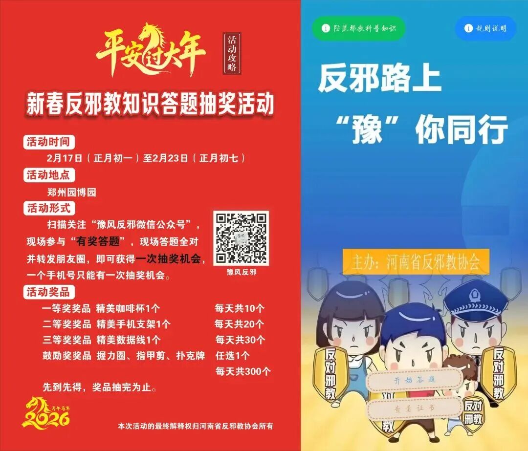 2月17日至2月23日(农历正月初一至初七),在郑州园博园新春“园宝寻福记 潮玩中国年”庆典活动现场,河南省反邪教协会成功举办了“平安过大年”新春反邪教知识答题抽奖活动。