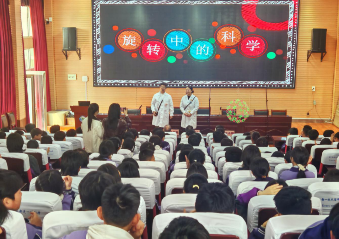 学校礼堂里,“旋转中的科学”主题实验秀精彩纷呈,“百变开花球”“旋转陀螺仪”“转速之谜”等趣味实验轮番上演,生动揭示了旋转运动背后的科学原理,赢得阵阵掌声。同时,科技志愿者组织学生观看反邪教科普知识宣传展板,宣传讲解《科普法》知识,引导师生崇尚科学、远离邪教。