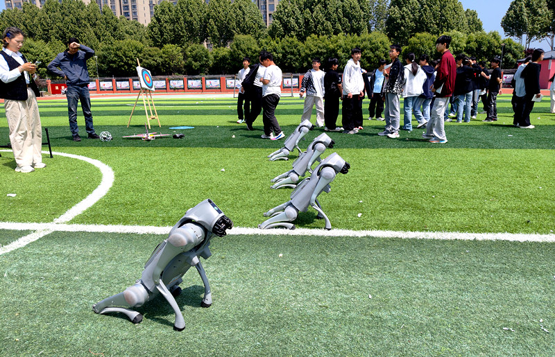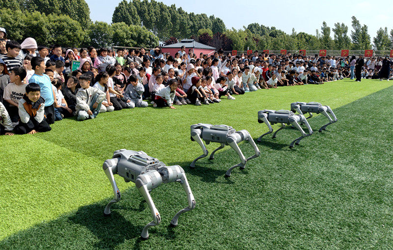 四只智能机器狗整齐亮相展演现场,完成列队行进、原地转向、互动摆拍等一系列标准化动作,展现智能科技与机械操控的完美融合,以呆萌灵动的姿态,点燃现场学生参与热情,直观感受人工智能科技魅力。