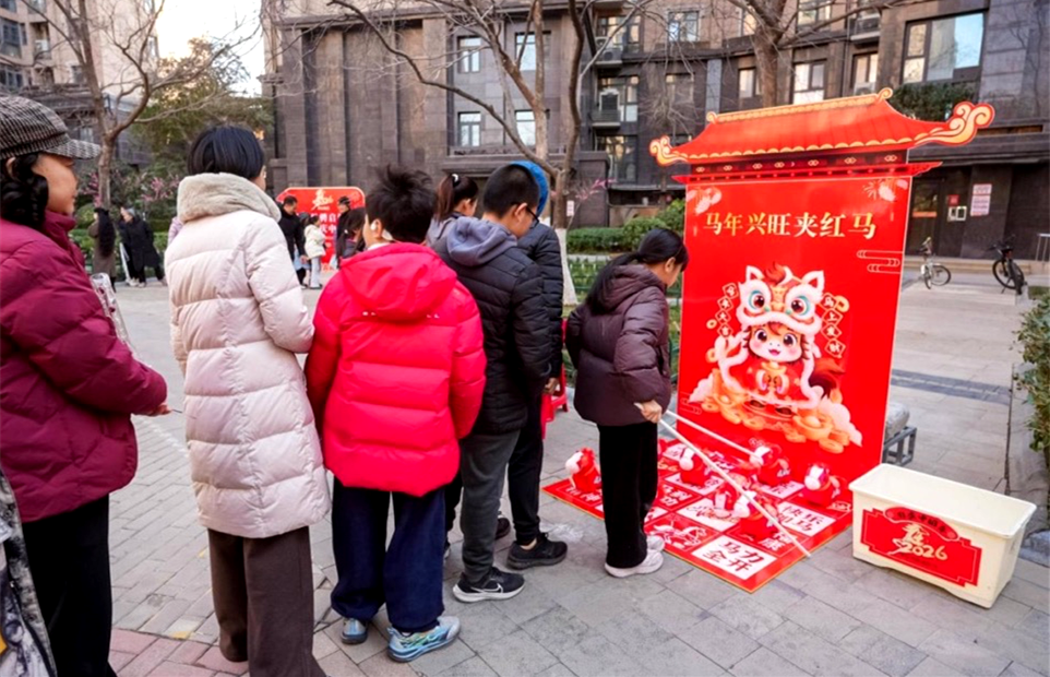 “新春潮玩互动”区里,欢乐与惊喜交织。“新春潮玩盲盒”通过趣味转转盘开启好运,精美小礼品与意外惊喜让居民们喜笑颜开;“趣味互动游戏”区的马年主题竞技更是精彩纷呈,“马到成功球一球” 的精准投掷、“马年兴旺夹红马”的灵巧比拼、“马启新程圈好运”的欢乐套圈、“金马迎春接福气”的趣味挑战,居民们全情投入,欢呼声、喝彩声此起彼伏,温情在互动中悄然沉淀。