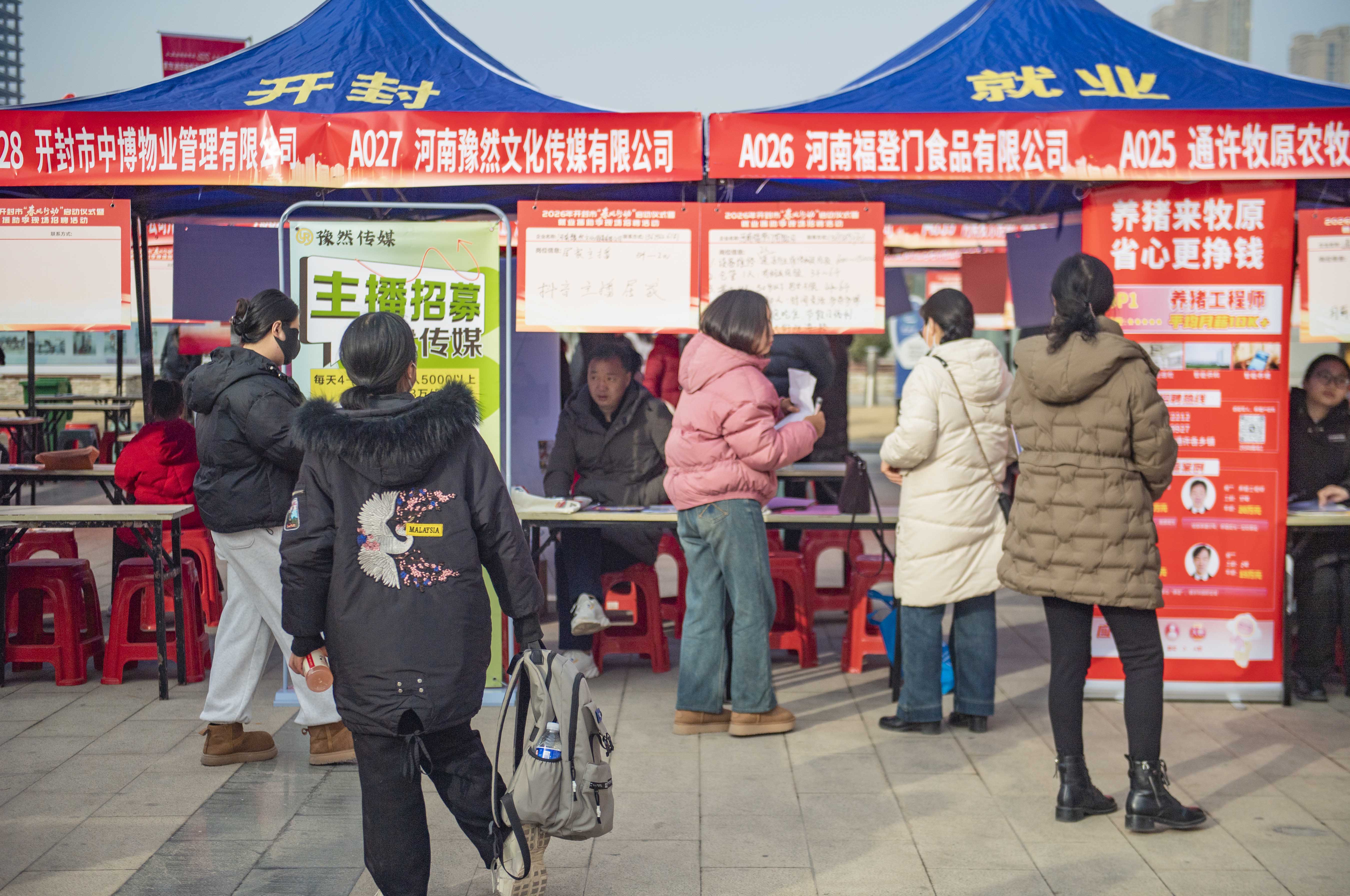 主播招募,月入5000以上,18-45岁零基础小白、宝妈均可以做(不影响接送孩子上下学)……普工:男、初中及以上学历,45岁以下……技术员:男25-45岁,大专以上学历、化工、磨料磨具相关专业……”2月12日,各类用工招聘信息在开封市民之家南广场上引人注目;当日是腊月二十五,2026年开封市春风行动暨就业援助季现场招聘活动在此如期举办。